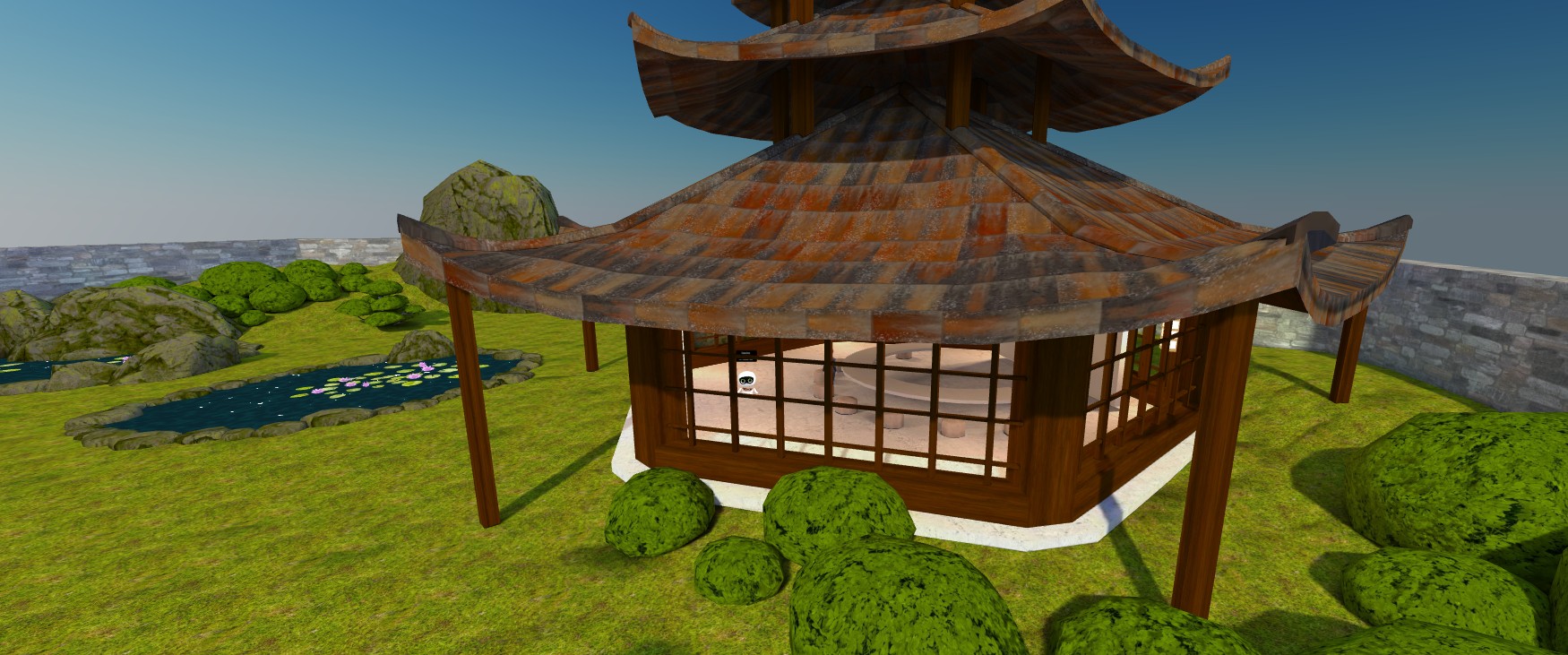 The FrameVR space is a serene, beautifully detailed single-room Japanese-style pavilion set within a manicured garden landscape, complete with ponds, winding paths, and lush greenery. The intimate and contemplative atmosphere makes it uniquely suited to reflective discussion and smaller gatherings. During iLRN 2026, the space will host conference presentations alongside static displays, self-guided audio tours, and informal unconference social gatherings that invite spontaneous connection and conversation.