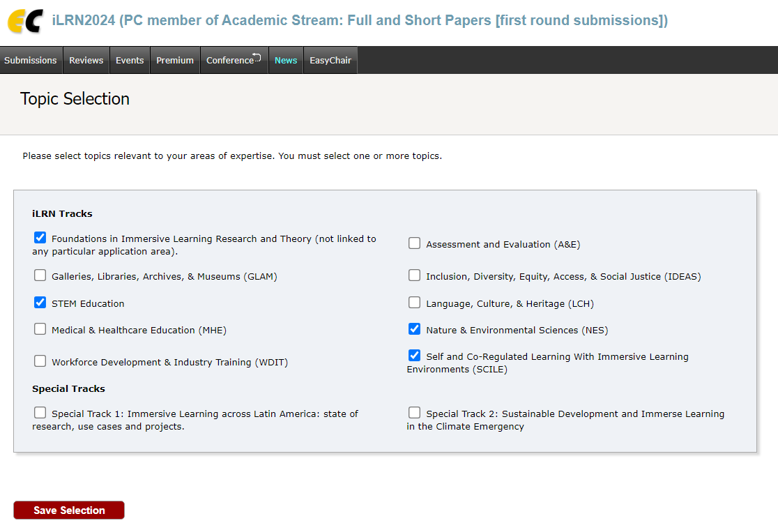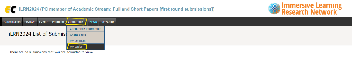 The topics based on the iLRN conference tracks and branch houses (https://www.immersivelrn.org/initiatives/houses-of-application/) will be used to assign papers to you for review, so that you can review the papers which fit your areas of expertise and interest. If you do not set your topics of interest in the system, we assume that you are open to review submissions from all topics.