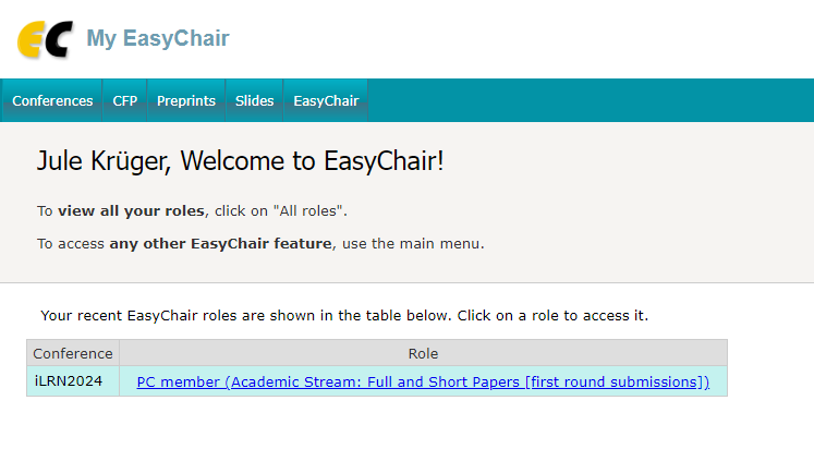 In this view, you might see more than one conference, if you have used EasyChair in other conferences, or you may see multiple roles in the iLRN conference, for example if you are a PC member in multiple tracks or also submitted a paper as an author. If you do not see the iLRN PC member role that you think you should see, try clicking the "All roles" link in the top right corner (not in this screenshot). If you still do not see the role, you might still need to accept your invitation to the Program Committee. Contact conference@immersivelrn.org if you still have issues with finding the role.