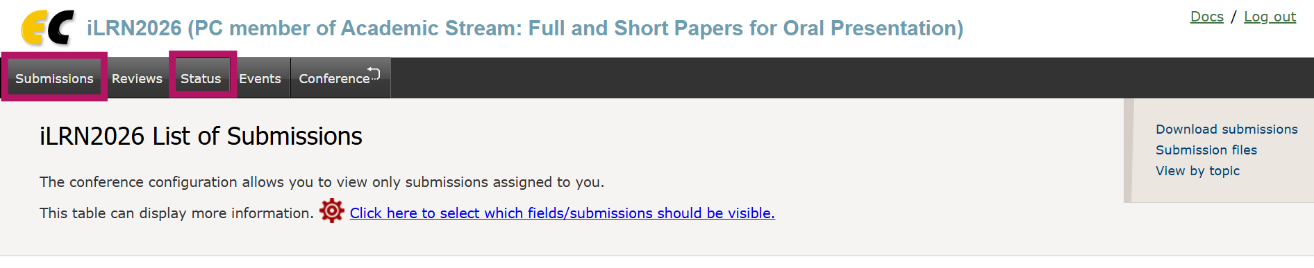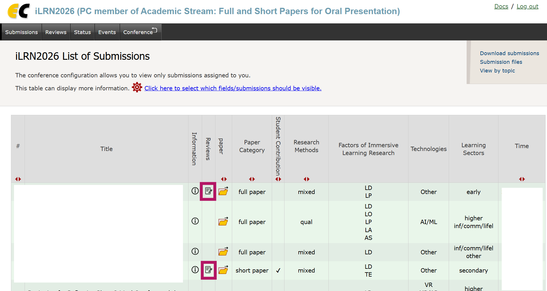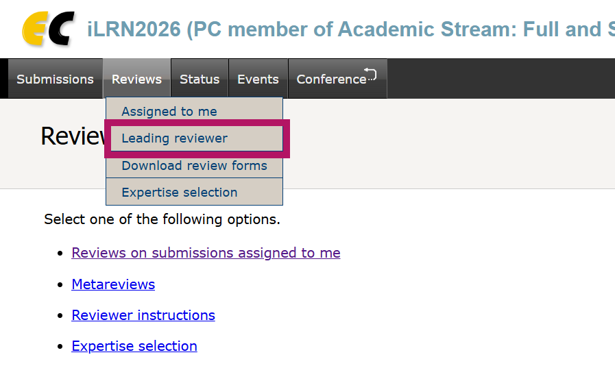 Through "Assigned to me" or "Leading reviewer" menu items, you will also get to tables similar to the ones in the Submission List menu. Again, the symbol in the "Reviews" column can be clicked to get to the review overview page for that paper. From there, continue as described below.