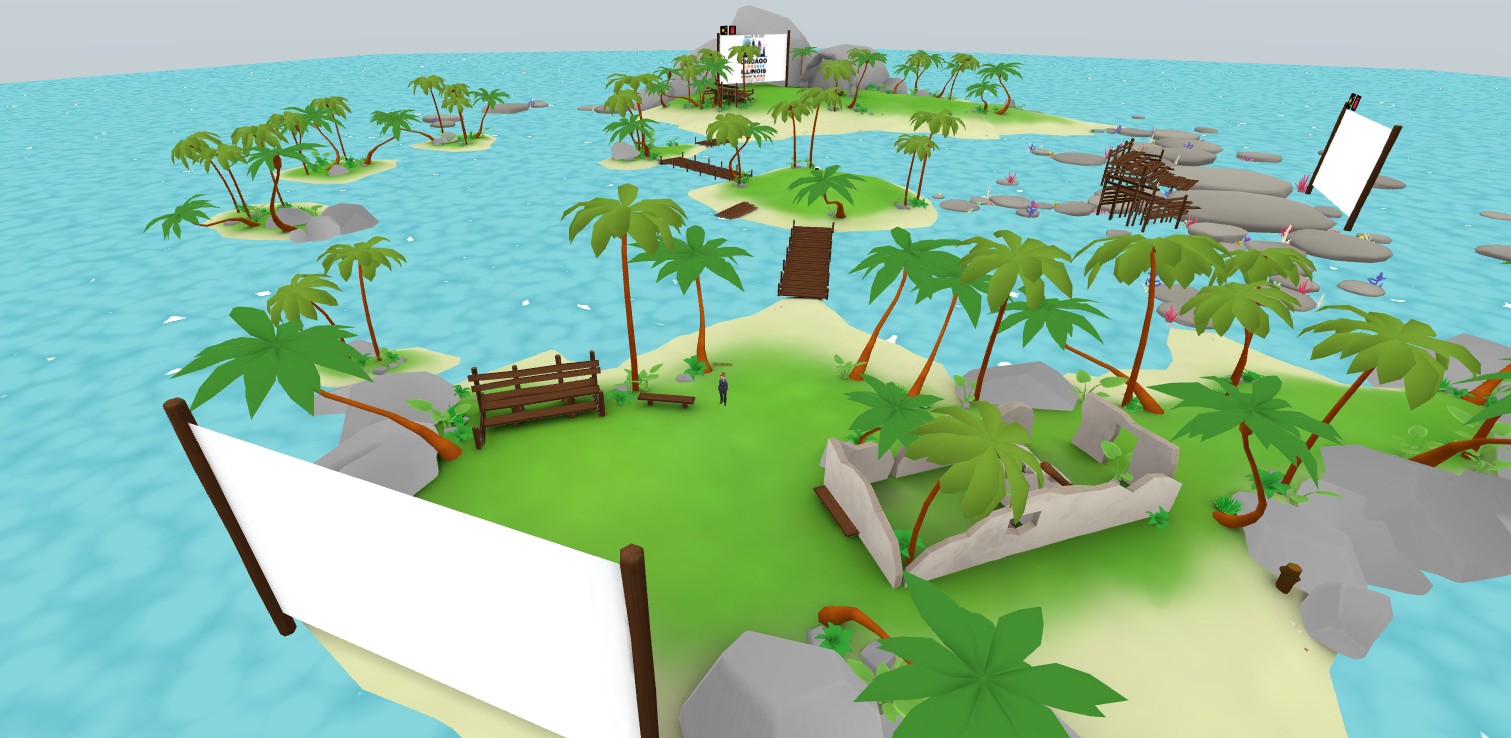 The current Guided Virtual Adventures frame includes multiple islands with display screens and contains space for large presentations or events (shown above). As of January 29, 2026, it has not been decorated for iLRN 2026 (contains signage for Chicago 2025) or assigned to host regular activities.