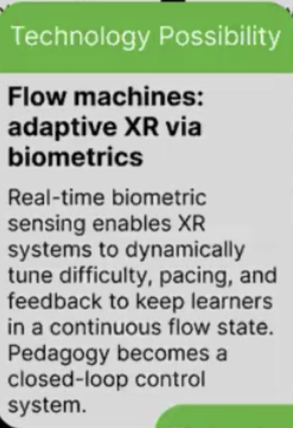 Participants examined the idea that XR systems could sense learner state continuously and adjust difficulty, pacing, modality, and feedback to sustain engagement—framing pedagogy as a closed-loop control system rather than a fixed instructional sequence.